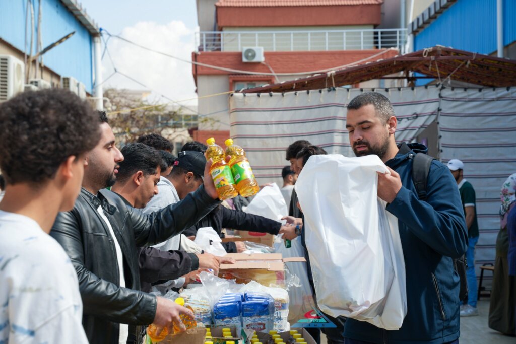 The students undertook all stages of planning—from launching the campaign idea to collecting monetary and in-kind donations from benefactors and securing the required food supplies. At exactly 12:00 noon, the university courtyards turned into a large workshop, professionally managed by student volunteers, to prepare comprehensive food baskets carefully composed of high-quality items to support needy families.